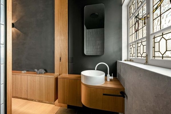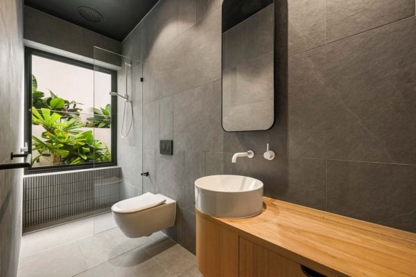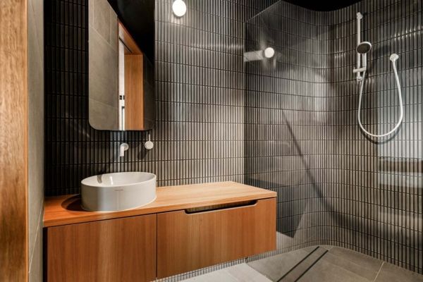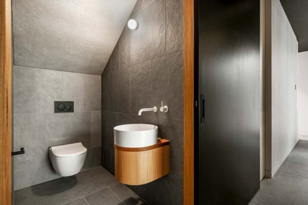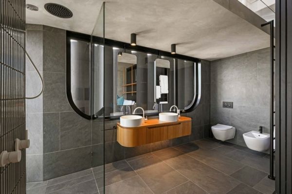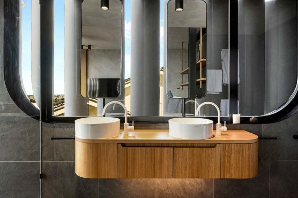 Continuing the sleek aesthetic, the bathroom features custom-fitted vanities with integrated storage, glossier surfaces, and subtle minimalist hardware. The result is a calm, elegant space that complements the kitchen’s modern sensibility while adding functional class.