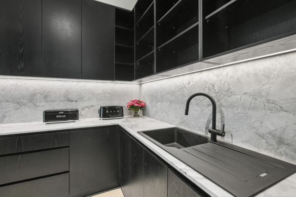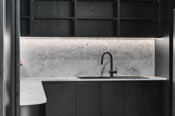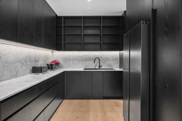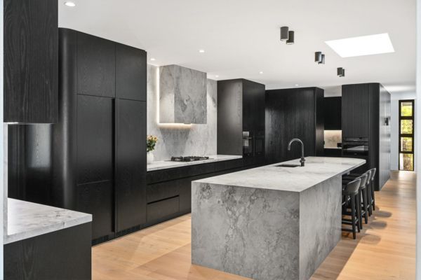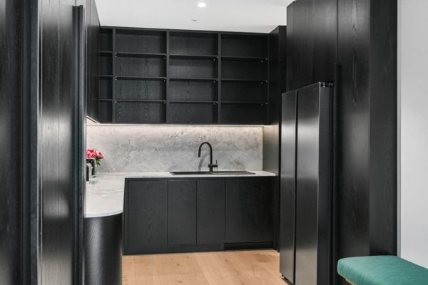 This kitchen stands out with its sleek black cabinetry, offering a dramatic yet elegant base. The natural timber shelving and joinery soften the darker tones, adding warmth and texture.