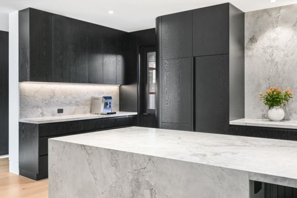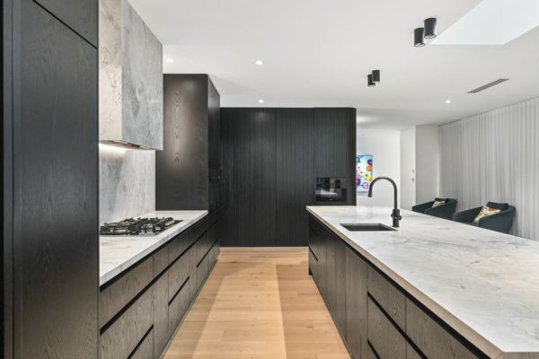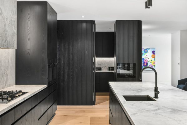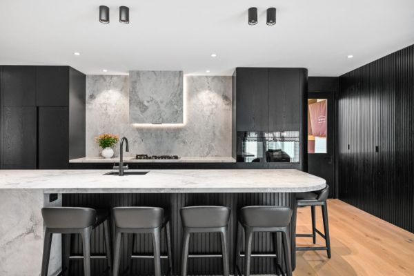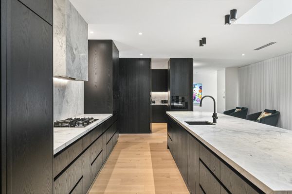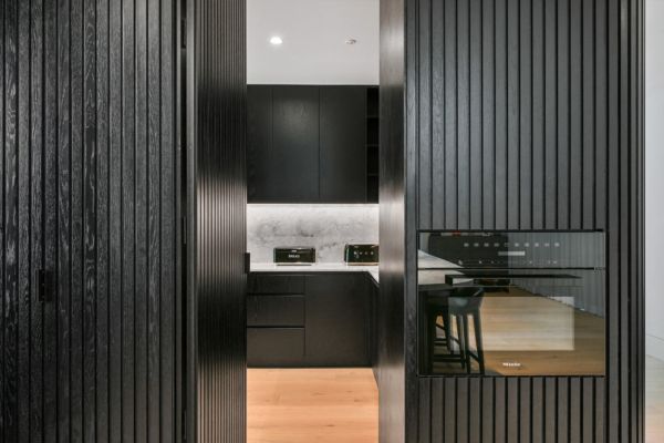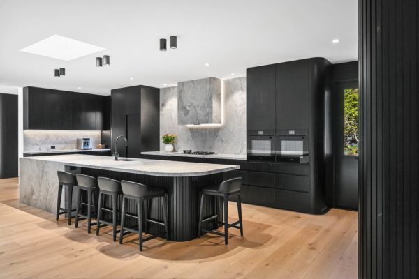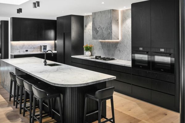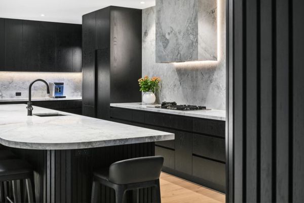 Matte black cabinetry, timber detailing, and clean stone finishes work together to create a cohesive, contemporary space that’s both stylish and practical.