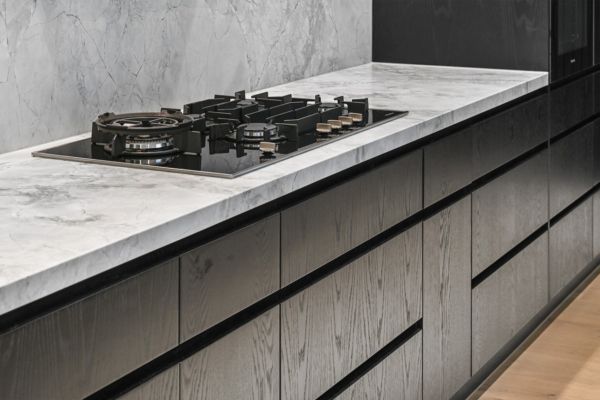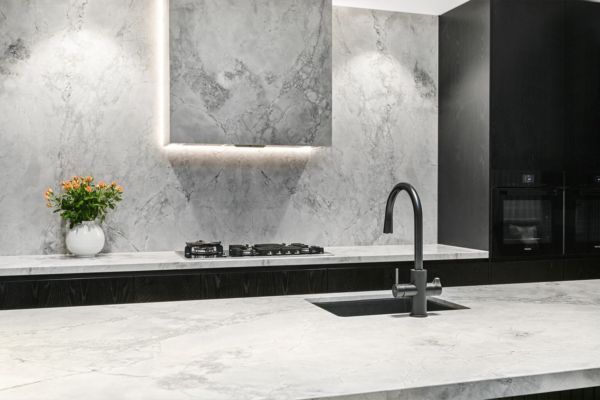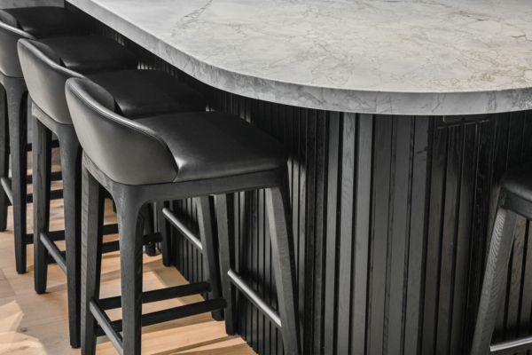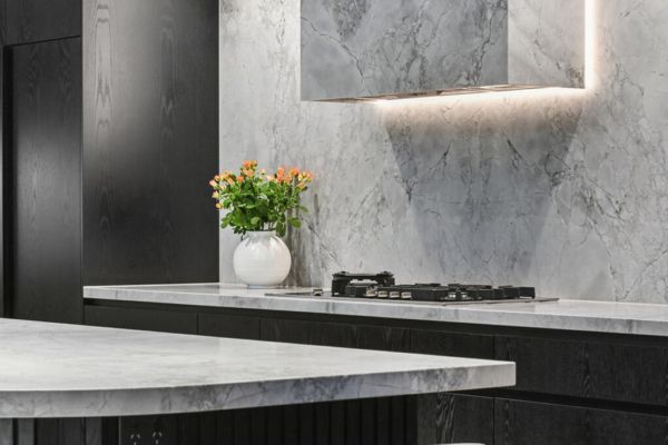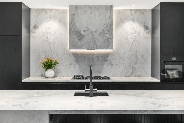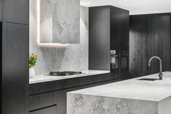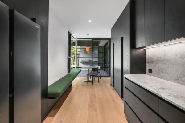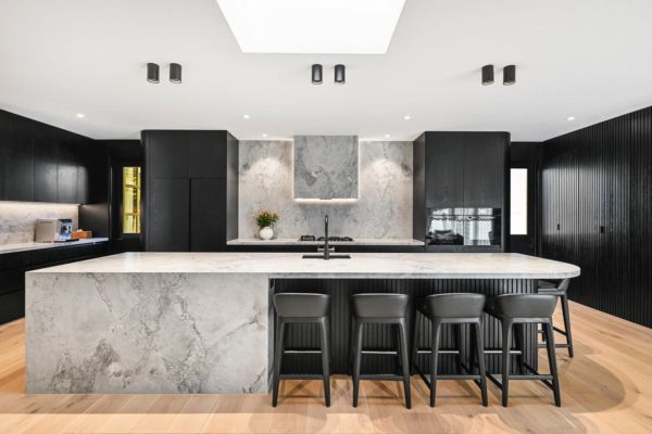 Bold yet balanced, the Mayes Street kitchen and living area reflects PK Kitchen Design’s skill in combining striking materials with refined functionality.