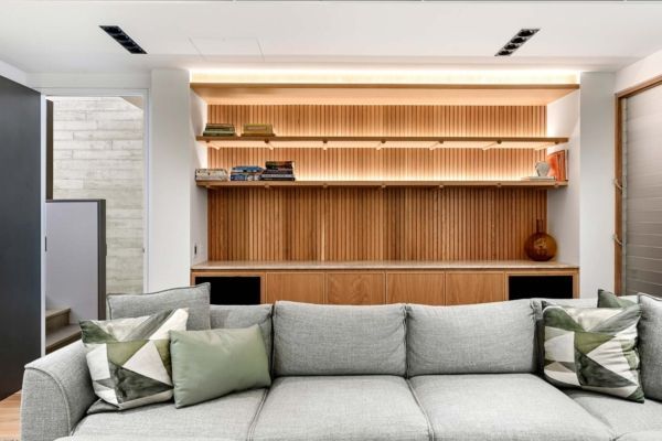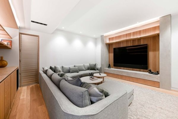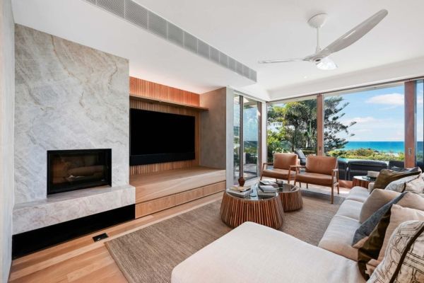 The living area continues the light, natural palette, grounded by the use of timber flooring and soft, neutral furnishings. Large sliding doors open directly onto the back deck, blurring the boundaries between inside and out. Natural light floods the space, enhancing the home’s airy and relaxed atmosphere.