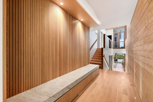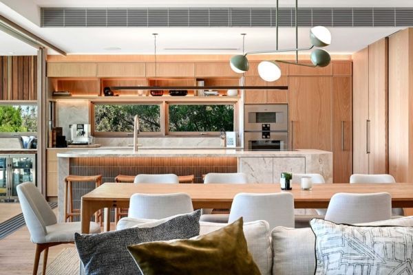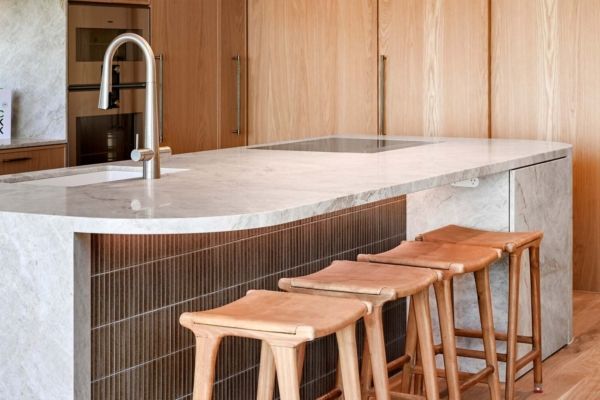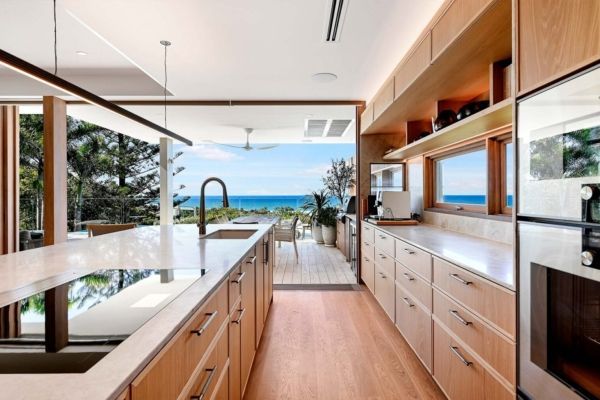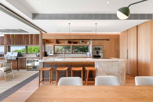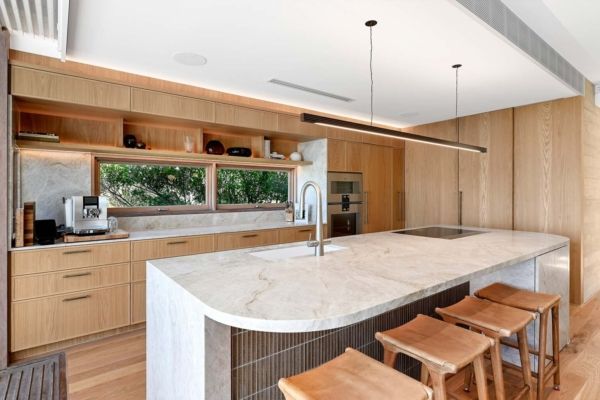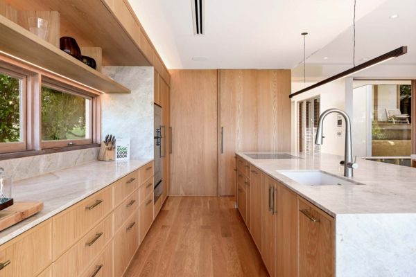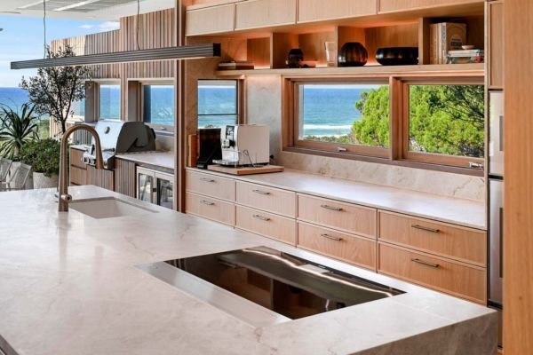 Open shelving in light timber tones adds a relaxed, coastal feel while offering practical display space. The cabinetry is streamlined and minimal, helping keep the kitchen bright and uncluttered. Subtle details bring in a modern edge without overwhelming the space.