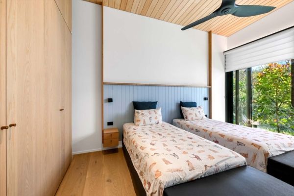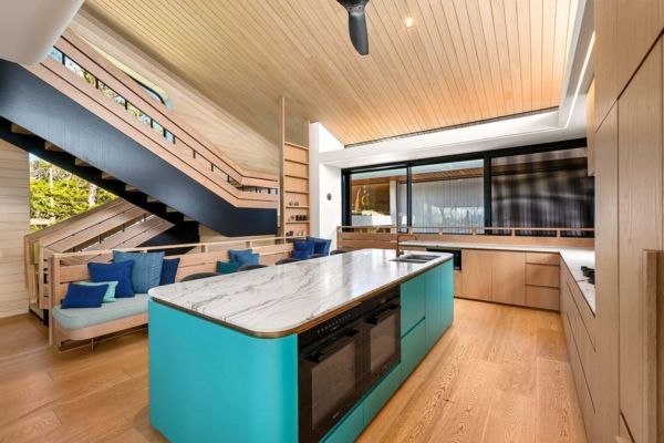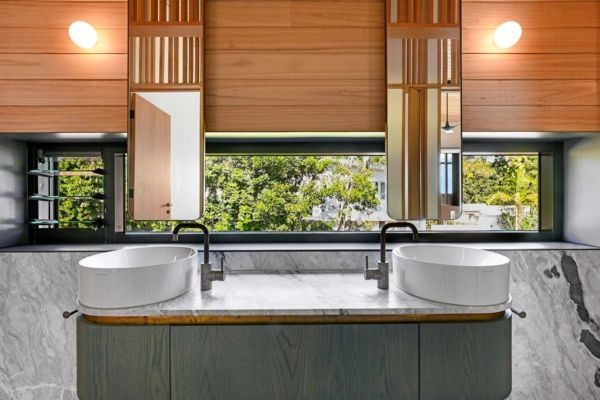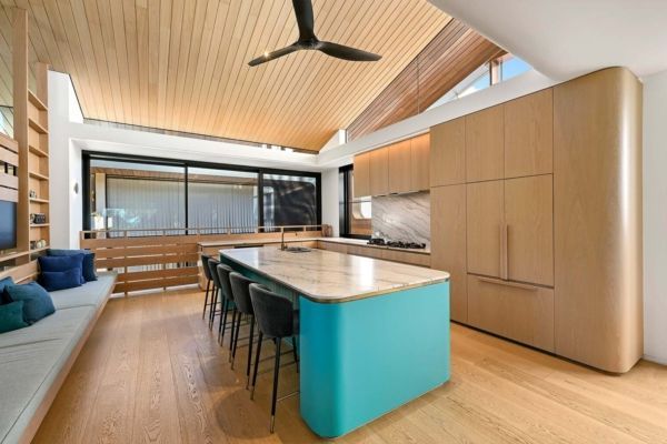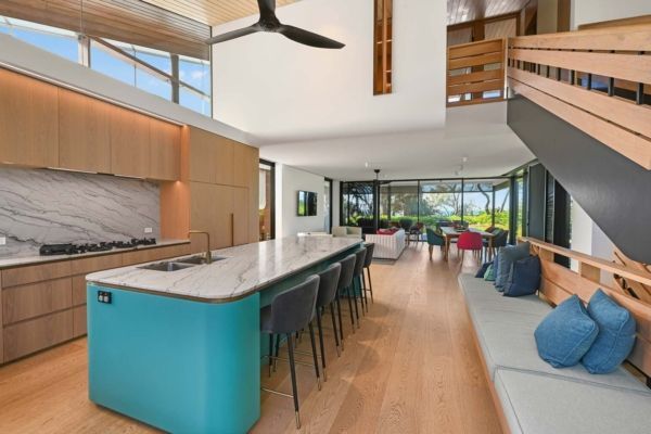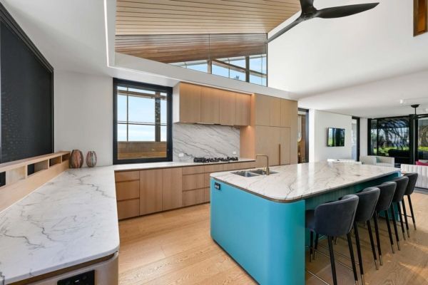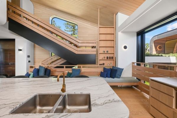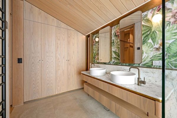 Coastal Sophistication in Detailing: The natural materials selected—oak, stone—nod to Peregian Beach’s serene beauty. The tactile oak, with soothing grain patterns, and the stone’s natural veining evoke coastal textures. Farmer-style doors soften the palette—inviting, breezy yet polished.