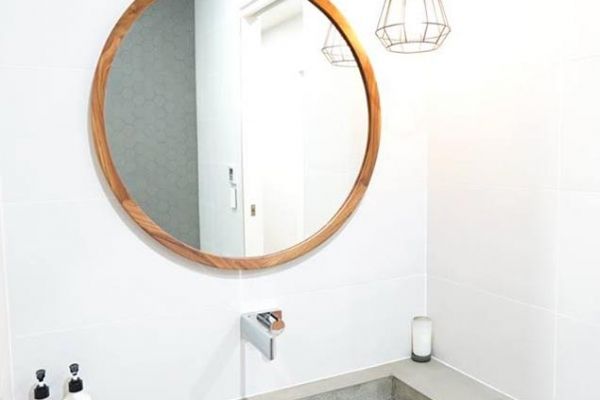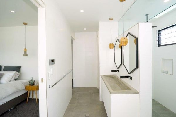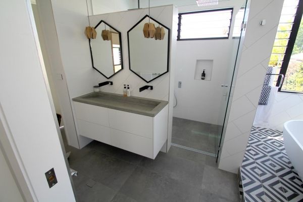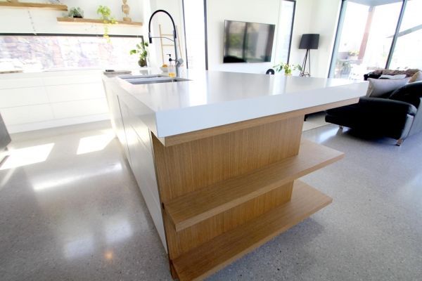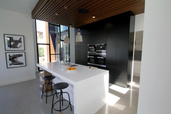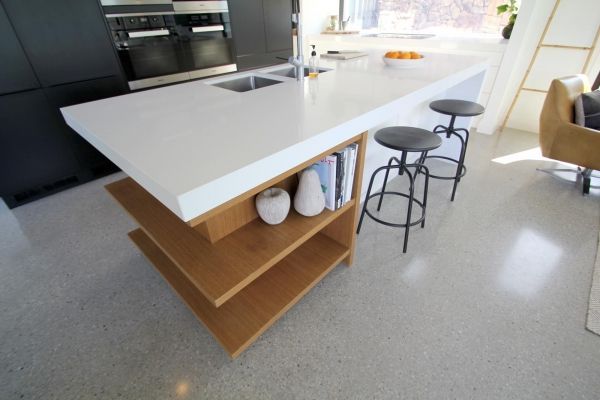 Caesarstone tops 80 mm thick integrated fridges and appliances and vanities have concrete benchtops.