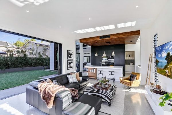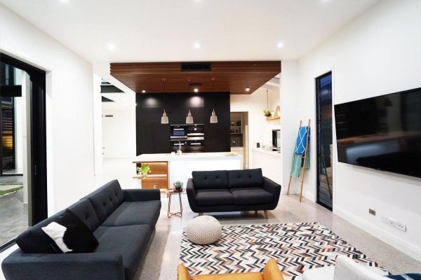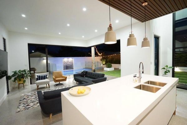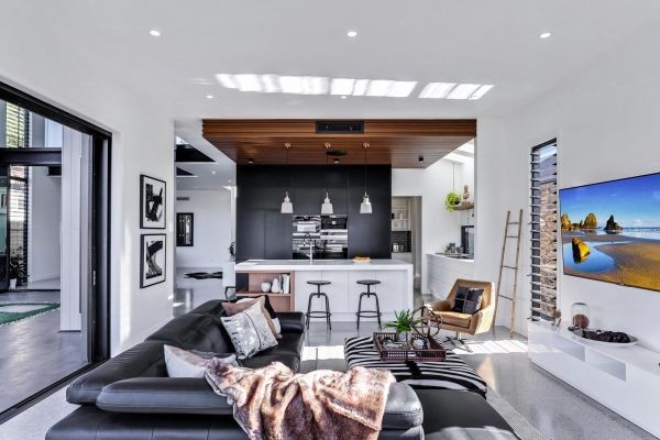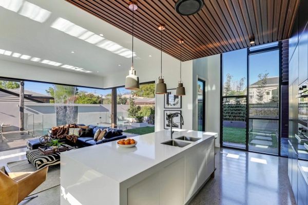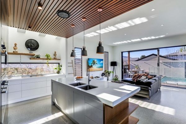 The kitchen flows directly into the living space, fostering interaction and continuity. The addition of timber in flooring or ceiling accents brings coziness and natural texture to the bright, modern tones.