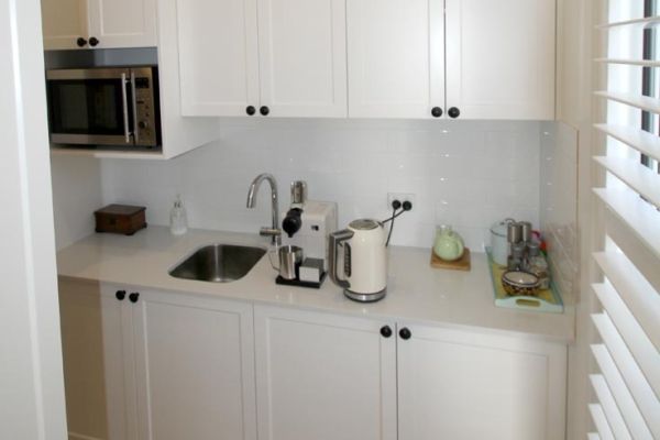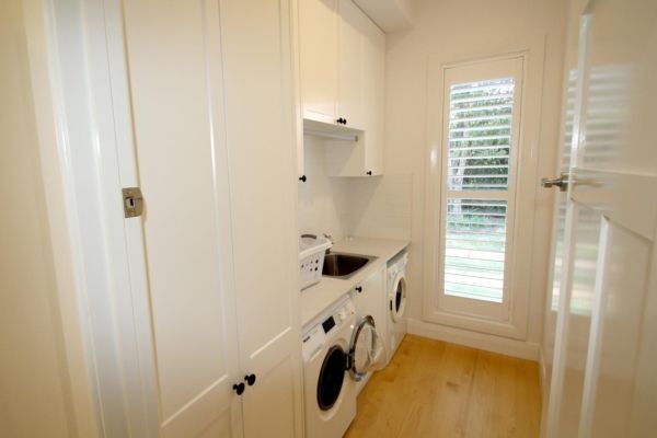 Inside the utility alcove, the design remains consistent—same shaker cabinetry, same light palette. There’s a bench with integrated sink, perfect for food prep and laundry duties. The layout maximizes usability—you can work in a compact area without feeling restricted.