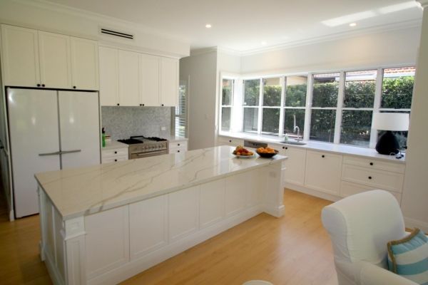 Dominating the room is a substantial island centerpiece, topped with thick, luxurious stone that resembles Calacatta marble. The smooth veins in the pale surface add elegance, while the size of the island promises plenty of workspace—or a casual gathering spot for friends and family.
