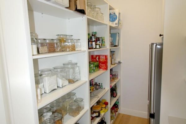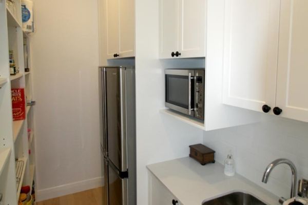 Tucked behind the main kitchen area is a clever utility alcove—big enough to serve as both food storage and a laundry. This hidden zone keeps chores out of sight, simplifying your view of the kitchen while maintaining function.