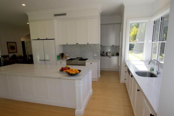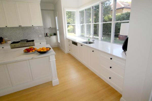 A spacious, light-filled kitchen painted in soft white, warmed by pale wooden floors and brightened by ample window views.