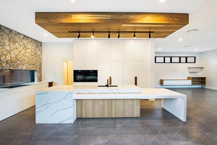 Imagine walking into a bright yet calm kitchen where sleek stone, warm wood, and textured stone come together in a perfectly balanced mix.