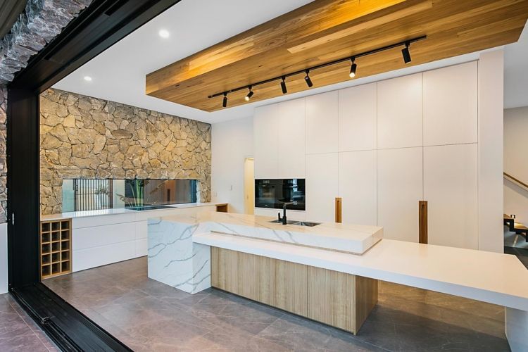 Behind the island, a full stone feature wall adds rich texture and boasts a raw, understated beauty. It’s the kind of detail that makes a space feel intentional and connected to nature.