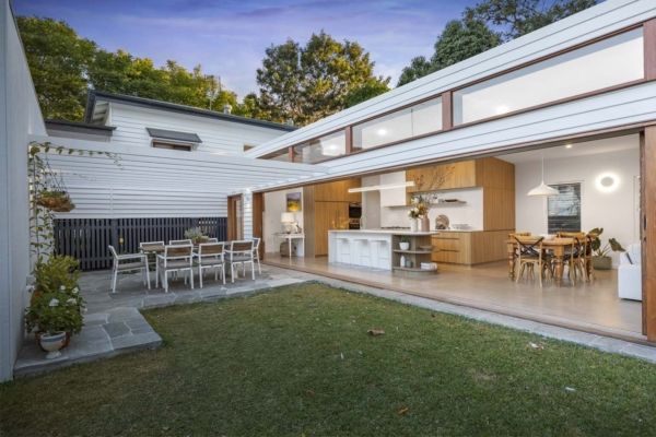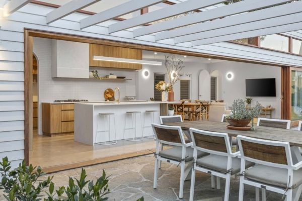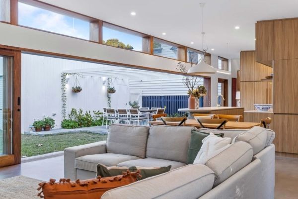 This contemporary home features a calm, refined interior opening up completely to the back deck, driven by clean lines, muted tones, and bespoke joinery throughout.